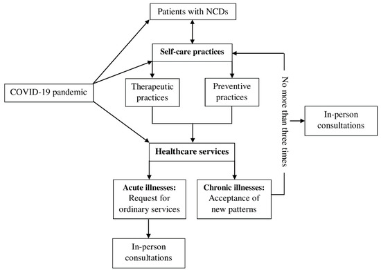 The COVID-19 pandemic influenced the self-care practices of patients with NCDs. The importance of self-care was considered from a bidirectional perspective. Most patients paid more attention to therapeutic and preventive self-care practices during the pandemic; however, some were too concerned about other aspects of their lives, such as their financial situation. The pandemic led to changes in the pattern of healthcare services. While patients accepted the new methods used to provide services, remote services were not able to replace in-person services in the long term.
