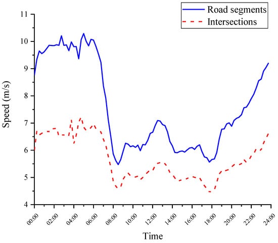 An exploratory analysis of the data was performed, which included the speed distribution, acceleration, and deceleration distribution at different times at intersections and in road segments. From Figure 2, the speed at intersections is significantly lower than the road speed at any time. This result is mainly due to traffic lights, traffic conflicts, and pedestrian traffic at intersections, resulting in a reduced speed. Furthermore, the speed distribution clearly shows the peak characteristics in the morning and evening and at night (0–6 a.m.) when the speed is much higher than that during the day. This distribution is consistent with previous studies on the traffic characteristics of Chengdu [40].