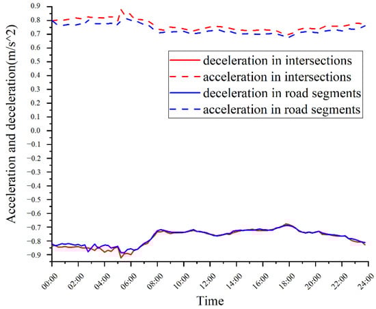 Additionally, the average acceleration and deceleration through intersections and road segments at different times were analyzed. As shown in Figure 3, the acceleration and deceleration values also change with time, with higher values at night. The acceleration at intersections is found to be greater than that in road segments at any time. Moreover, the data also reflect the asymmetric acceleration and deceleration characteristics, which means that the deceleration value is higher than the acceleration value, i.e., approximately 1.5% higher at intersections and 4.4% higher in road segments.