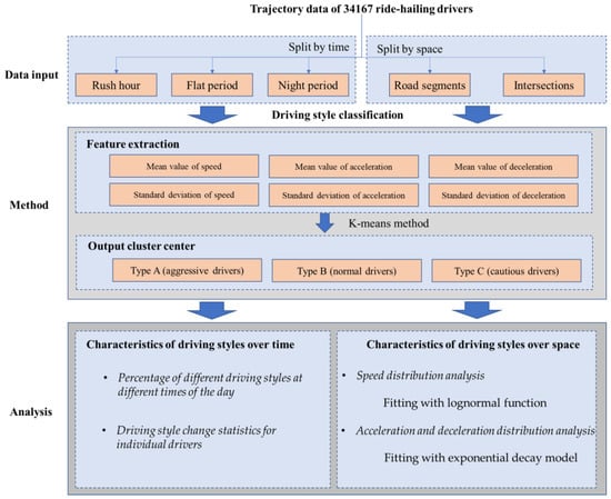 In Section 2, the characteristics of the overall data were analyzed. However, to study driving style, the characteristics of each driver are essential. First, driving features need to be extracted from the driving parameters, which were used to represent the driving style of a ride-hailing driver. Then, a method is needed to classify the driving styles of these drivers. We used an unsupervised learning clustering method, which is simple and efficient. A flow chart of this study is shown in Figure 4.