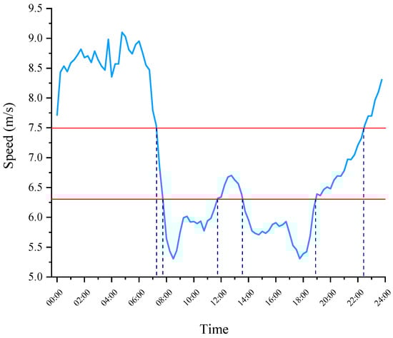 The difference in the velocity distribution and acceleration distribution may be due to different traffic flow statuses instead of different driving styles. Therefore, the analysis should be carried out under the same traffic flow status. Generally, the data are divided into several time periods, assuming that the traffic state does not change within the same period. In a previous study, the whole day was uniformly divided into several periods or defined as a general peak and flat period [15,50]. There may be multiple traffic conditions in the same time period, such as morning and afternoon. For example, refs. [5,36] believed that 7:00 a.m.–10:00 a.m. is a peak period. However, as shown in the speed curve in Figure 2, this division of time does not fit this dataset. Different from previous studies, we divided the whole day into several discrete periods according to the distribution of the speed and divided the data with similar speed characteristics into the same group. The data were grouped by traffic flow status in this method. As shown in Figure 5, three groups of data were obtained. We defined the first group as rush hour, with speeds less than 6.3 m/s, and the periods were 7:45–11:30 and 13:45–18:45. The second group was defined as the flat period, with speeds ranging from 6.3 to 7.5 m/s. The time periods were 7:15–7:30, 11:45–13:30, and 19:00–22:15. Additionally, the third group was defined as the night period, with speeds above 7.5 m/s, and the periods were 22:30–24:00 and 00:00–7:30. Six features were extracted from the three groups of data and used for a cluster analysis. See Section 4 for the results.