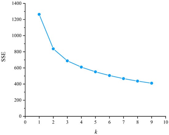 The feature data of 34,167 drivers were applied to the k-means method, and the elbow rule was used to determine the optimal value of k. The results are shown in Figure 6. We can see from the results that when k ≥ 3, the sum of squares error (SSE) value changes more smoothly. Therefore, k = 3 was selected as the optimal clustering value.