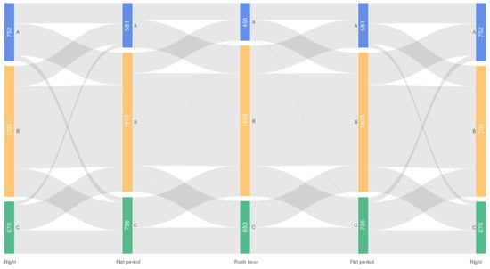The proportion of driving styles changes over time, which indicates that there are some drivers who belong to Type A during rush hour and Type B at night. We understand how many drivers will change their driving styles over time, which is helpful for assessing how many mature drivers are in the road network and providing targeted training for ride-hailing drivers. Because skilled drivers generally maintain a stable driving style, a more stable driving style helps improve traffic efficiency and safety and reduce energy consumption [6,54]. The change in driving style of drivers over time is shown with a Sankey diagram (Figure 7). Notably, although there were 34,167 drivers for the whole day, only 3130 drivers were recorded in all three periods. Therefore, data recorded from drivers during all periods are necessary to analyze driving style shifts over time.
