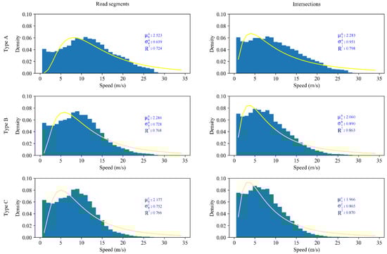 First, the speed distribution was analyzed. Speed distribution histograms of different types of drivers at road segments and intersections were plotted, and a lognormal function Equation (2) was used to fit the speed distribution, where x denotes the speed, μ is the scale parameter (the mean of the log of the distribution), and σ is the shape parameter (and is the standard deviation of the log of the distribution). The fitting curve is shown in Figure 8.