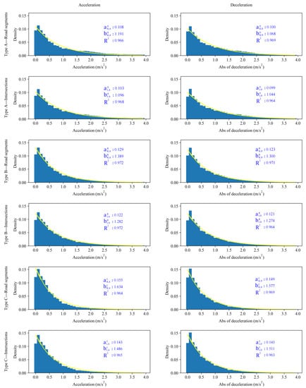 The most important parameter affecting the exponential model is the value of b (the scale parameter). The larger parameter b is, the closer the curve is to the coordinate axis, which means that the acceleration and deceleration values are concentrated at smaller values. To facilitate the subsequent analysis, we define , , , and as the acceleration and deceleration distribution fitting parameters of the Type A driver in the road segments. Correspondingly, , , , and are defined as the acceleration and deceleration distribution fitting parameters of the Type A driver at the intersections. , , , and , , , , and are the fitting parameters of Type B drivers in the road segments and at the intersections. , , , and , , , , and are the fitting parameters of Type C drivers.