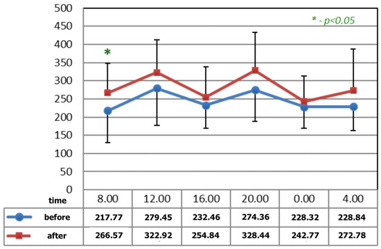 The circadian concentrations (ng/mL) of serotonin before and after 15 applications of magnetotherapy. * statistical significance.
