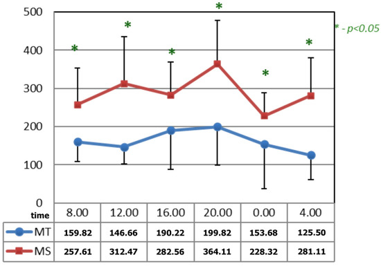 Figure 1 and Figure 2 show statistically significant differences after the application of magnetotherapy at 04:00 a.m., when an increase in serotonin concentration is observed, whereas the serotonin concentration is higher after magnetic stimulation at 08:00 a.m. These are the time points for low melatonin levels in circadian rhythm.