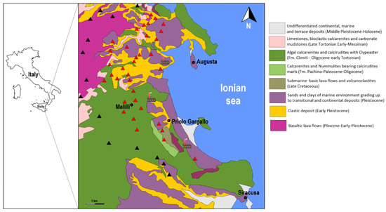 - Carbone, S. Note Illustrative Della Carta Geologica d’Italia Scala 1:50,000, Foglio 641 Augusta Ed. ISPRA—Regione Siciliana, 2011; ISBN 978-88-240-2965-0. [Google Scholar]
