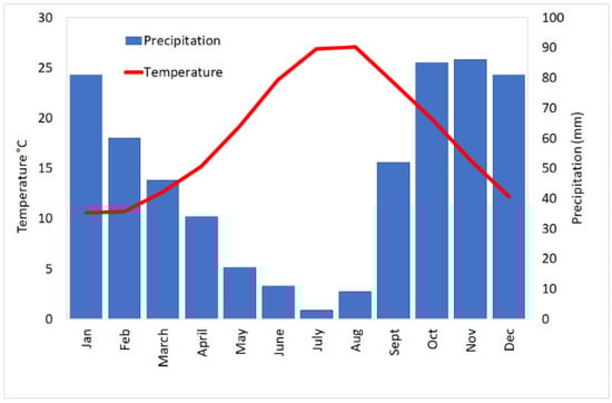 Weather data from meteorological station of Augusta. Mean monthly precipitation (mm) and mean monthly temperature (°C).