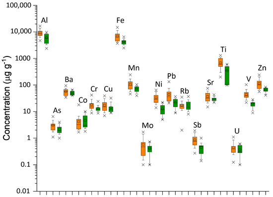 A strong association between elements of crustal origin Al and Ti was identified with R = 0.91 (p < 0.05). Various elements of typical geogenic contributions such as Ba, Co, Rb, and Sr reveal good correlations (R = 0.65–0.72) highlighting the heterogeneity of the type of outcropping rocks. For Sr, it is not possible to exclude an anthropic contribution, considering the good correlations with Cr and Mn (RCr = 0.71; RMn = 0.67, p < 0.05). Furthermore, good correlations have also been found between Cr, Fe, and Mn (RCr-Fe = 0.66; RCr-Mn = 0.64; RMn-Fe = 0.63). The link between these elements may be crustal origin [48]. The Spearman correlation coefficients between V, Ni, Sb, Pb, and Zn were calculated within the range of 0.68–0.87 (p < 0.05). These elements are mostly emitted from anthropogenic activity such as fossil fuel combustion and refineries [48,49].
