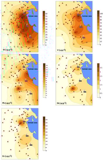 Figure 4 shows the spatial variations of accumulation of some trace elements representative of the main factor extracted from the FA. The highest concentrations of Ni, Pb, V, and Zn are generally detected in samples collected near petrochemical plants.