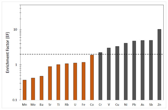 Average enrichment factors (EFs) for the analyzed elements in lichen samples from the survey area. The dashed line indicates the boundary between enriched and non-enriched elements.