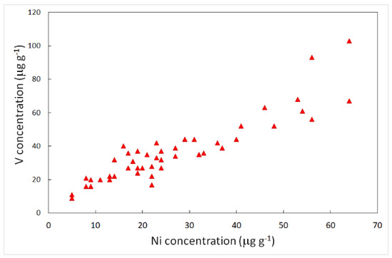 Some elements traced by the factor analyses and enrichment factors are listed as potentially toxic to humans. These elements do not play an essential role, but several studies have emphasized that their presence in the human body can induce disease. The International Agency for Research on Cancer (IARC) has classified vanadium pentoxide as possibly carcinogenic to humans [52]. Although there is some evidence that vanadium is an essential nutrient, its functional role in humans has not been established [53]. It is well-known that the most important source of vanadium in the atmosphere is fossil fuel combustion [54] In this study, the highest concentrations of vanadium in lichens were found in those samples collected close to the industrial zone, and this was also true for a nickel. The analyses revealed high contents of nickel, corresponding to high contents of vanadium, with a correlation coefficient of 0.87 (Figure 6).