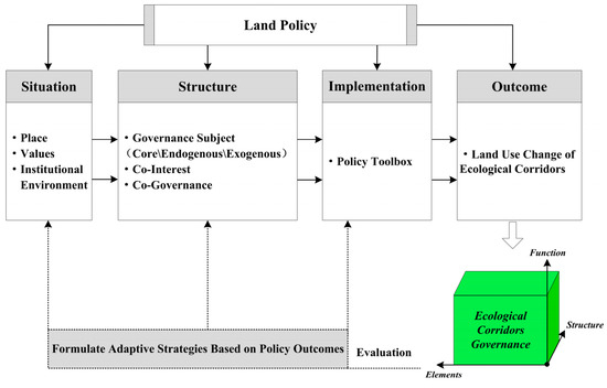 With the help of the SSIO policy process analysis framework, this study analyzes the driving mechanism of land governance policy on the LUC within ecological corridors. This method can demonstrate the process of occurrence and organizational relationship of LUC in a panoramic way. Defining a local context, developing an organizational structure, selecting policy tools, and realizing adaptive governance are the four stages of systematically understanding the policy driving mechanism of LUC within ecological corridors. Finally, the proposed framework can be used to help to deconstruct the policy black box of ecological space governance and to better understand the process of ecological space governance.