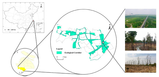 In order to protect urban green space, the Shanghai Municipal Government formulated the Shanghai Basic Ecological Network Plan in 2010, which is the main component of Shanghai’s ecological policy and lays the foundation for the delimitation of ecological corridors. According to the Shanghai Land Consolidation Plan (2016–2020) and the Shanghai Ecological Corridors System Plan (2017–2035), the total area of the Shanghai ecological corridors is 2476.46 km2. The ecological corridor in the Jinshan District is a typical example of Shanghai ecological corridors. The total area of ecological corridors in the Jinshan District is 160.30 km2, which accounts for 27.35% of the total land area in the Jinshan District (Figure 2).