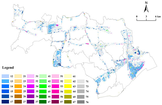 The geo-informatic Tupu method is a type of geographical spatial-temporal analysis method that is commonly used to reveal the internal structure and spatial differentiation of geographical elements [47]. Additionally, the geo-informatic Tupu analysis method can reveal the spatio-temporal change in the LUC using the Tupu unit. The Tupu unit is the fundamentally functional unit in integrated spatial-temporal analysis of land use [47]. As with the basic geographical unit, the division of the relatively homogeneous Tupu unit is also very important for such research [48]. The Tupu units of LUC in this study were summarized into one type, that is, land use type changes from 2009 to 2019. For example, Code 15 is a Tupu unit, which represents cultivated land in 2009 changed to construction land in 2019, and other codes follow the same rules.