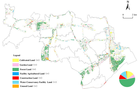 Rising graphics of land use in the ecological corridors of Jinshan District. (Note: the legend “cultivated land (+)” represents the spatial distribution of other land types transformed into cultivated land, and other legends follow the same rules.)