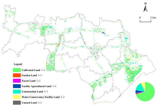 Falling graphics of land use in the ecological corridors of Jinshan District. (Note: the legend “cultivated land (-)” represents the spatial distribution of cultivated land transformed into other land types, and other legends follow the same rules.)