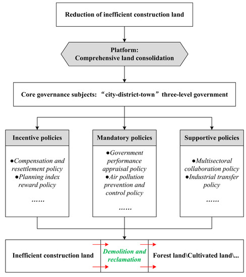 (1) Organizational policy tools: These mainly include general consolidation and reclamation, municipal land consolidation projects, country park construction, and the reduction in inefficient industrial land directly promoted by government agencies. The reduction in inefficient construction land refers to the reduction in and reclamation of inefficient construction land in rural areas into cultivated land or ecological land by using policy measures and engineering technology. The policy tools used in the reduction in inefficient construction land can be divided into incentive policies, mandatory policies, and supportive policies (Figure 7). In addition, comprehensive land consolidation activities are widely carried out in the ecological corridors of the Jinshan District. With the help of comprehensive land consolidation, country parks in the ecological corridors of the Jinshan District realize the reduction and reclamation of rural inefficient industrial and mining land, homestead, and other construction land and focus on the management of fields, water, roads, and forests. The Basic Ecological Network Planning of Shanghai stipulates that large forests can be built within ecological corridors, in combination with the protection of basic farmland, and country parks can be arranged at important nodes. This provides a planning basis for the layout of country parks at appropriate nodes within ecological corridors, which will help promote UGI investment.
