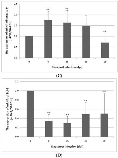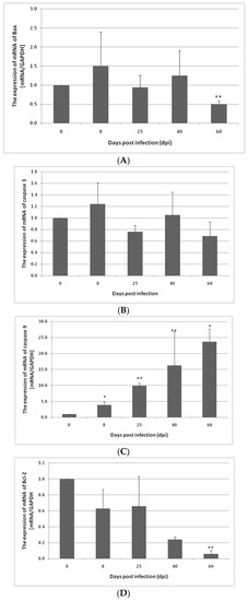 3.1. Changes in Apoptosis Gene Expression in the Small and Large Intestines of the Rat during H. diminuta Infection