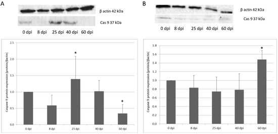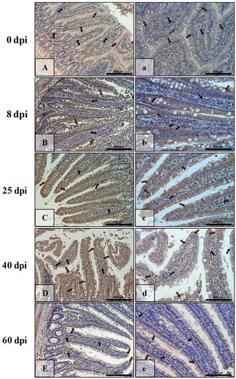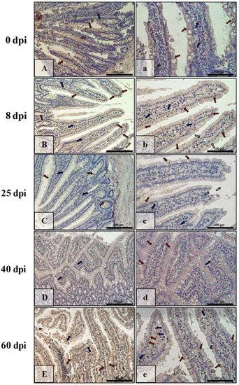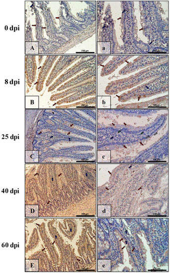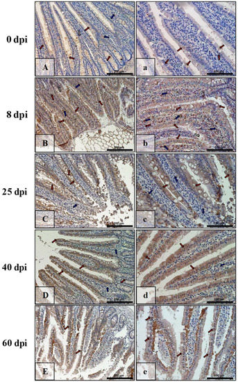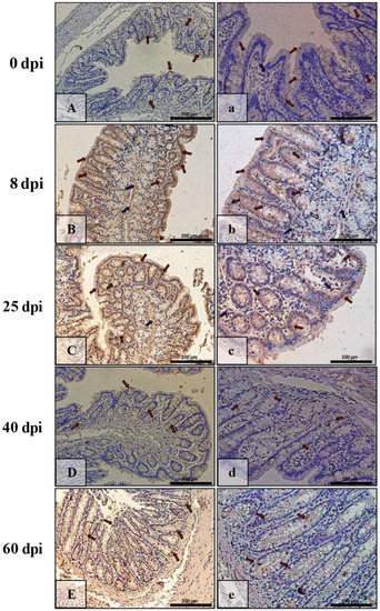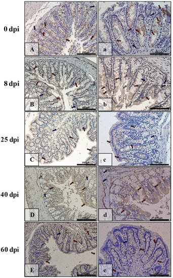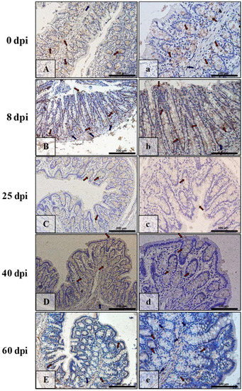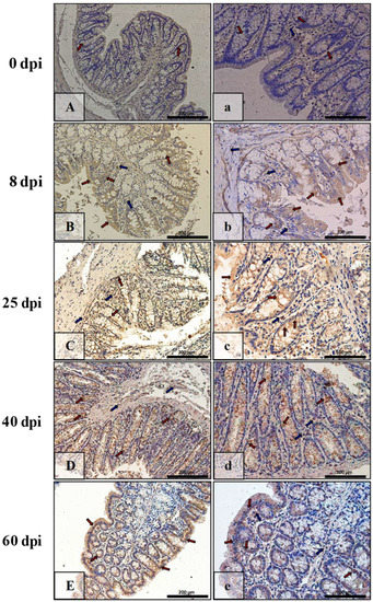| Marker | Part of Intestine | 0 dpi (Control) | 8 dpi | 25 dpi | 40 dpi | 60 dpi |