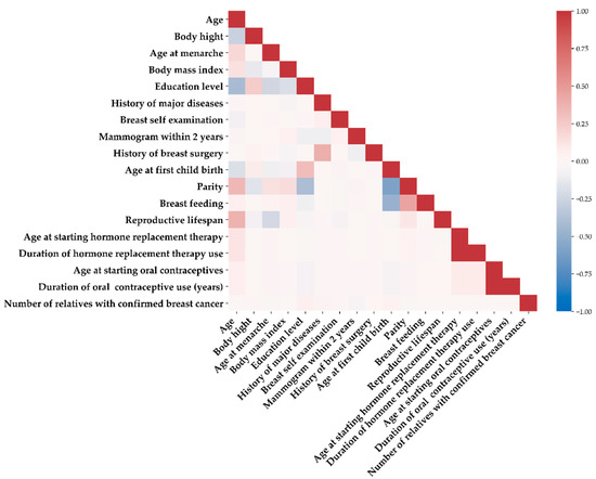 Figure 2 shows a heatmap visualization of the correlation matrix between the 18 predictor variables to explore the relationship between the variables using Spearman’s correlation coefficient [25]. As shown in the figure, the higher the correlation between the variables, the darker the color. The colors red and blue indicate positive and negative correlations, respectively. According to the correlation matrix, the correlations among the 18 variables were compatible with the clinical presentations. The three most remarkable correlations were as follows: First, early age at first childbirth was associated with an increased number of pregnancies. This association was consistent with that reported in a previous study [26]. Second, a younger age of starting hormone replacement therapy correlated to a longer duration of hormonal treatment. Third, a younger age of beginning oral contraceptives was positively related to the duration of contraceptive use.