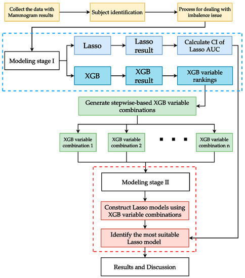 The proposed integrated ML scheme combines the benefits of two well-known ML algorithms, namely, least absolute shrinkage and selection operator (Lasso) logistic regression and extreme gradient boosting (XGB), to generate complete and adequate model prediction and important risk factor identification results. XGB and Lasso methods are both widely and successfully used techniques in breast cancer/mammography researches [17,18,19,20]. They are also commonly used approaches to selecting the critical predictor variables in healthcare and medical informatics applications [21,22]. XGB could effectively identify important variables when the variables have nonlinear and/or high dimensionality interactions [23,24]. However, it cannot provide the direction of influence of the selected important variables. Alternatively, Lasso can present the influence directions (positive or negative) of the selected predictor variables on the target variable. However, it may not adequately select significant variables when the variables contain multivariate and nonlinearly interacting information. In the proposed scheme, the XGB model was first used to select and rank the important predictor variables. The ranked variables were then used to generate stepwise-based variable ranking combinations. The Lasso method was used for the combinations to generate the final predictive models.