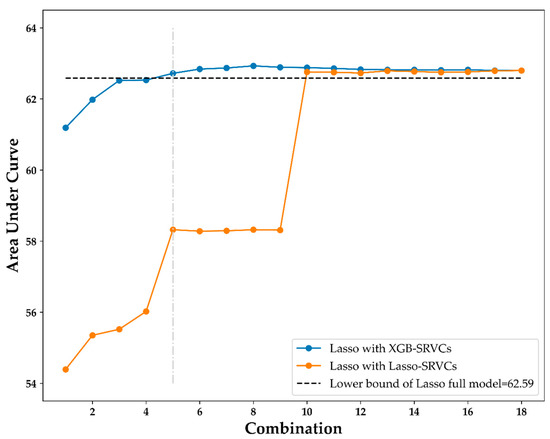Table 4 shows the first five combinations (C1–C5) of the XGB-SRVCs and the AUC of the Lasso method using each variable combination as a predictor variable. As presented in the table, although the number of variables increased, the AUC also increased and approached the lower bound of the CI of the AUC of the Lasso full model (62.59). For the fifth combination, the AUC was 62.72, which exceeded the full model’s AUC lower bound (62.59). These results indicate that the effectiveness of these five variables in training the Lasso model is the same as that of all 18 variables. Therefore, the number of variables required when training the Lasso model is reduced.