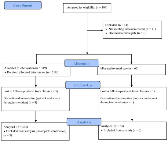 Convenience sampling was employed to enroll all eligible seventh-grade students from two junior high schools with similar value teaching systems in rural and coastal areas in Taiwan. As inclusion criteria, eligible participants were required to be present at the baseline, display an ability to read and speak Chinese, and be willing to complete the questionnaires. Considering the exam and class schedules, one school allowed 13 classes of seventh-grade students to participate, among which some students declined to participate (n = 3), which served as the intervention group (n = 319), while the other school allowed two classes to participate, which served as the control group (n = 66). We excluded current smokers after intervention and data collection to avoid bias from different perspectives between smokers and non-smokers. Therefore, 367 students’ data were used for analysis after excluding those who provided incomplete data (n = 3), discontinued intervention (n = 9), or were lost during follow up (n = 6). Figure 1 presents a Consolidated Standards of Reporting Trials (CONSORT) flow diagram of this study.