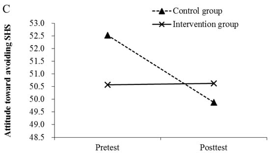 Mean score of (A) Knowledge of smoking, (B) Knowledge of SHS, and (C) Attitude toward avoiding SHS in the pretest and posttest for each group.