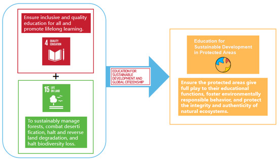 The implementation of Sustainable Development in protected areas (PAs) has become a necessary measure around the world [1,2,3]. In 2015, the United Nations formulated 17 goals for 2030, representing the world, is addressing a wide range of social and environmental problems in an interconnected global effort [4]. As an important component of Sustainable Development Goal 15 (SDG15), protected areas are not only the most effective measure for biodiversity conservation, but also play a key role in achieving other SDGs [5,6]. Protected areas are important natural classrooms of Education for Sustainable Development (ESD) [7,8]. Implementing ESD in PAs can also better exert environmental advantages and realize the educational function of PAs, as shown in Figure 1. On the platform of protected areas, ESD can reach full potential and become a cohesive and powerful engine.