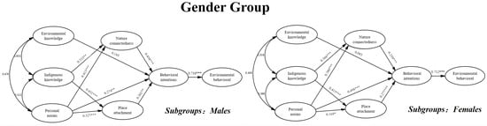 As shown in Table 11, both those with volunteer experience and without volunteer experience were significantly influenced by environmental knowledge, personal norms, nature connectedness, and place attachment, and neither group was directly influenced by their indigenous knowledge. Based on the values of critical ratios for differences between parameters, the difference in coefficient between environmental knowledge, personal norms, indigenous knowledge, and place attachment for the with volunteer experience and without volunteer experience groups was insignificant, while nature connectedness was significant. This result was not in accordance with the previous model comparison result, in which the structural weight model of the two volunteer experience groups did not differ from the unconstrained model. Therefore, the hypotheses of H1d, H2d, H3d, H4d, and H5d are rejected. The results of the path analysis are presented in Figure 8.