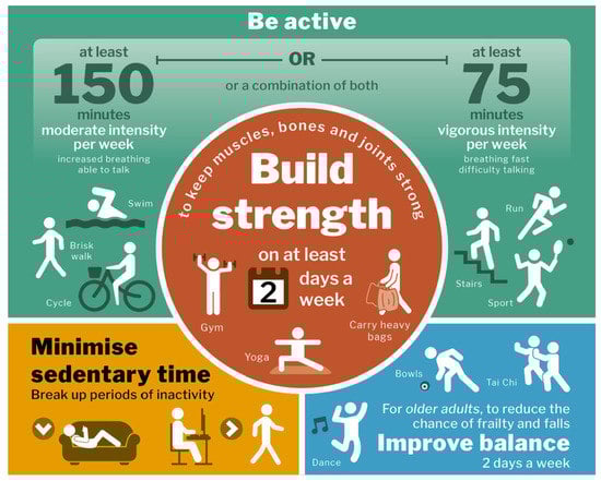 - The World Health Organization. WHO Guidelines on Physical Activity and Sedentary Behaviour. 2020. Available online: https://www.who.int/teams/health-promotion/physical-activity/developing-guidelines-on-physical-activity-and-sedentary-behaviour (accessed on 1 March 2022).