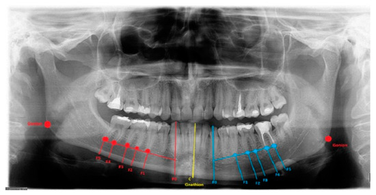 Secondly, the lower border of the mandible was outlined, and a vertical line from the tip of the canine, premolars, and molars was drawn perpendicular to the outlined marginal baseline. The collected radiological (panoramic) and tomographic (CT/LDCT) data were converted and archived. The horizontal volume of the bone from the tip of the roots toward the mandibular base was measured (Figure 1). Additional landmarks were set on the course of the mandibular canal to determine the distances between the roots, the mandibular base, and the mandibular canal itself.