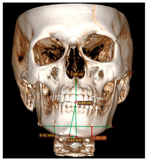 At the first planning step, the authors proposed the investigation and measurement of the degree of bone overgrowth, using anatomical-topographical features consisting of known index measurements (IMs): the preoperative anatomical landmarks (Go-Go), (Go(Right)-Gn), (Go(Left)-Gn), and (Me–Gn) shown in Table 1. The used anatomical landmarks are commonly known [18,19,20,29,30,31,32,33]. Anthropometric points in this paper refer to ARP and consist of the following: gonion = Go refers to the most posteroinferior part of the mandibular angle; gnathion = Gn is located perpendicular on the mandibular symphysis midway between the pogonion and menton; menton = Me is the lowest point on the mandibular symphysis [20,21,22].