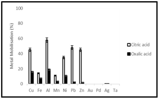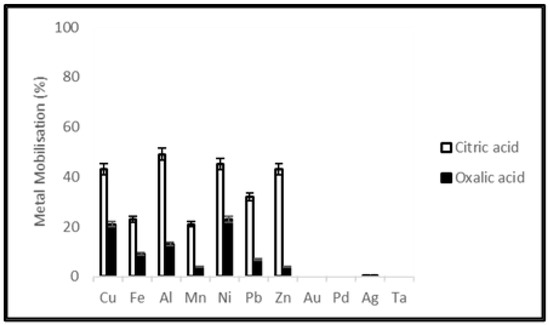 Synthetic organic acids namely citric acid and oxalic acid were selected to conduct a comparative study between chemical and microbial leaching mechanisms. Leaching was terminated after 20 days when the metal concentration in the leachate was relatively constant. Dissolution of the metallic fraction from electronic waste by organic acids involves various mechanisms including acidification and complexation. To compare chemical leaching using commercial citric and oxalic acids with microbial production, the molarity of acid solutions used was decided on from previous studies of their production by the filamentous fungus A. niger [36,37,38]. Citric acid gave better leaching efficiency than oxalic acid, however, commercial citric acid showed a lower extraction yield than the equivalent molarity during microbial leaching using A. niger filtrate. This study showed that purified and preconcentrated microbial extract could be a viable alternative for metal leaching.