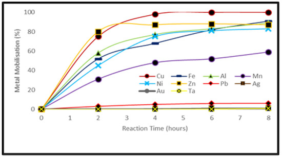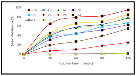 Metal solubilization through acidophiles is an electrochemical process based on oxidation-reduction reactions. Metals with lower standard electrode potential oxidize first [40] as compared to metals with higher standard electrode potential. Moreover, metal mobilization is highly influenced by the solubility of metals as in the case of Pb. Pb was not detected in the leachate and it was speculated that Pb was precipitated as PbSO4 in the form of white precipitates observed in the experimental flasks [23]. Similarly, the precious metals and tantalum were also not detected in the leachate.