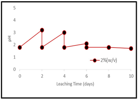 To avoid the inhibitory effect on bacterial growth due to the toxic nature of electronic waste, the bacterial culture was activated before being used in the microbial studies [35,36]. A rapid increase in pH was observed immediately after adding the grounded samples of PCBs and tantalum capacitor scrap. Higher material load showed higher pH value and lower leaching efficiency. After 4 days, pH for the lower material load (2%) maintained itself, however, for higher material loads, it had to be maintained till the end of the experiment. Figure 5 represents pH variance during microbial leaching at different pulp densities of PCB samples whereas Figure 6 represents pH variation for 2% tantalum capacitor samples during the experiment (Supporting Document Table S4).