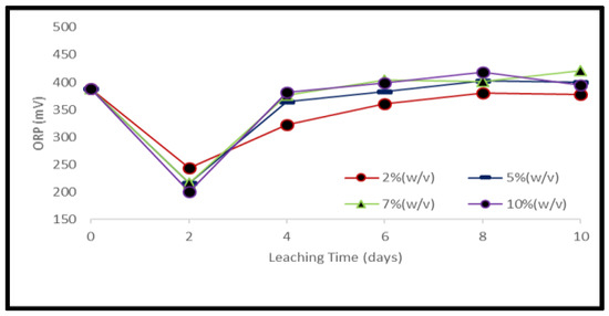 Evolution of ORP during bacterial leaching of PCB samples at different pulp densities.
