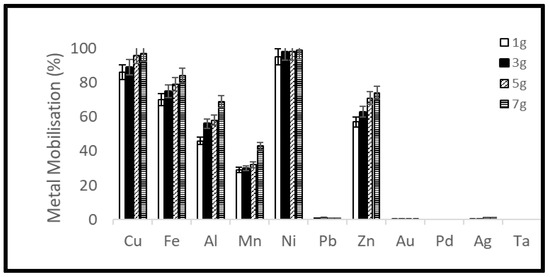 A reduction of the ORP of the solution was observed soon after the addition of samples which was stronger for the higher material load. On the third day of the experiments, the ORP of the solution started to increase again (Figure 7 and Figure 8). Metal mobilization from PCBs and tantalum capacitor scrap by acidophiles after a 10-day leaching period under different experimental conditions is shown in Figure 9, Figure 10, Figure 11 and Figure 12. A mixed consortium of acidophiles leached almost all base metals at higher rates from both PCB and tantalum capacitor samples while precious and rare metals were leached at negligible amounts.