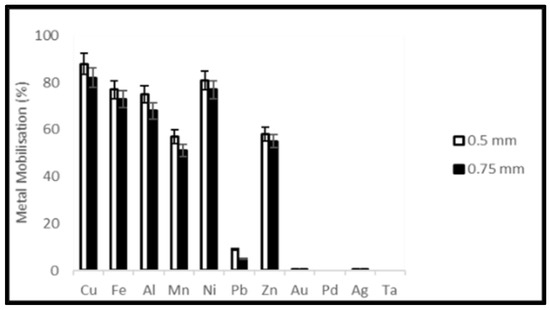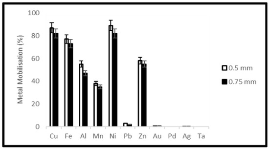 Metal mobilization from Ta capacitor scrap after 10 days bacterial leaching varying particle size.