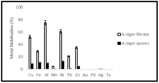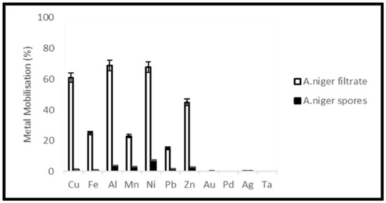 Due to the ability to remove toxic organic compounds [39] in samples and diversity in metabolic production, A. niger was tested for leaching of metals from PCB and tantalum capacitor scrap. Citric, oxalic, malic and gluconic acids are the most abundant acids produced by A. niger for carrying out the leaching process [47,48]. Metal mobilization by A. niger spores as well as filtrate was studied. A. niger filtrate showed better results and mobilized base metals Cu, Fe, Al, Ni and Zn at a rate of 52, 29, 75, 51 and 35% from PCBs and 65, 25, 69, 68 and 45%, respectively, from tantalum capacitor scrap.