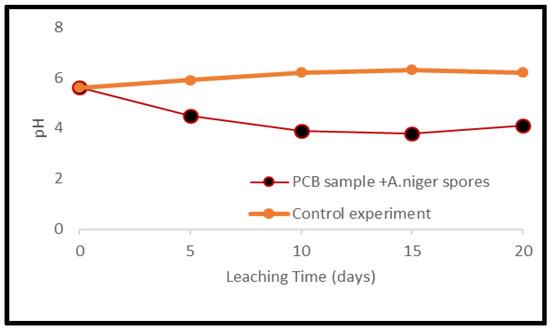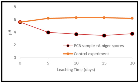 Metal mobilization from PCBs and tantalum capacitor scrap after a 20-day leaching period by A. niger spores and filtrate is shown in Figure 13 and Figure 14. The pH of the medium over the experimental time is given in Figure 15 and Figure 16.