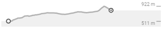 The event lasted 44 km with an accumulated positive altitude change of 503 m and an accumulated negative altitude change of 208 m (see Figure 1). The duration of the event was 8 h and 8 min.