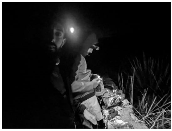 - Ultra-endurance event: At 14:45 p.m. 1 h pre-event, HRV was collected (20 °C, 20% humidity). From 15:45 to 23:54 p.m., race HRV was collected (see Figure 2) (13 °C, 82% humidity), and from 23:54 p.m. to 00:54 a.m., post-event HRV was collected (5 °C, 85% humidity). Before, during, and after the ultra-endurance event, the following parameters were analysed: rating of perceived exertion, leg pain, blood glucose, blood oxygen saturation, heart rate, temperature, urine colourimetry, urine nitrates, protein, glucose, and pH. Hand strength, leg strength, and respiratory muscle strength were analysed before and after the event. All analyses were conducted following previous procedures and analysis systems [18].