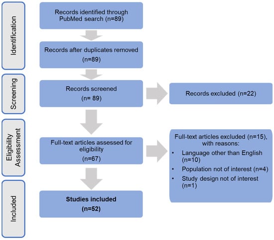 The search strategy rendered 89 citations, of which 22 were excluded during the title and abstract screening stage so that a total of 67 full-text articles were screened for eligibility. Of these, 15 were excluded because the vast majority (n = 10) were unavailable in English. Overall, 52 articles were included. Outcomes of the selection process are documented in the PRISMA flow diagram (Figure 1).