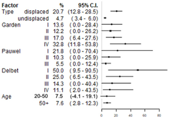 Due to the apparent heterogeneity of both study designs and their real-world settings, no formal testing for heterogeneity was employed. A random-effects model was used to estimate the pooled incidence of AVN depending on fracture type (displaced vs. undisplaced), Garden stage, Pouwels’ degree, Delbet stage, and age category (20–50 years vs. >50 years). The meta-analysis results are presented as pooled means with a 95% confidence interval (CI).