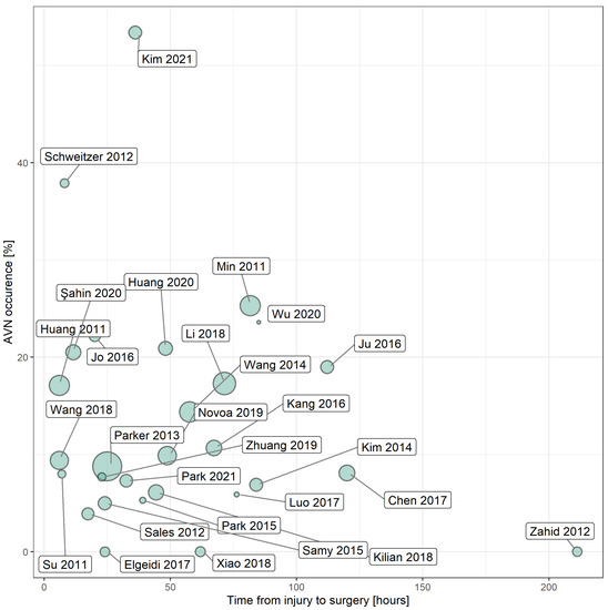 The relationship between AVN incidence and time from injury to surgery [16,17,22,25,27,28,29,30,32,33,36,40,41,42,43,44,45,47,49,51,52,54,55,56,57,59,65,67]. The size of the dot corresponds to the sample size of the study.