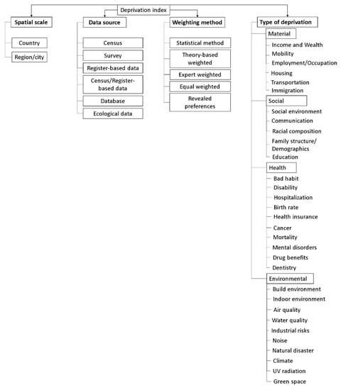 Chicago/Turabian StyleZelenina, Anastasia, Svetlana Shalnova, Sergey Maksimov, and Oksana Drapkina. 2022. "Classification of Deprivation Indices That Applied to Detect Health Inequality: A Scoping Review" International Journal of Environmental Research and Public Health 19, no. 16: 10063. https://doi.org/10.3390/ijerph191610063