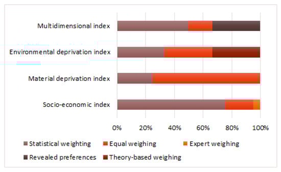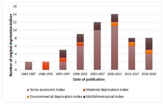 - Multidimensional indices, which were also divided into indices containing indicators of domains from sub-classes “social”, “material” and “health” [105,106]; “social”, “material” and “environmental” [107,108,109,110]; and indicators of domains from all sub-classes [32,34,111,112,113,114] (see Table S2).